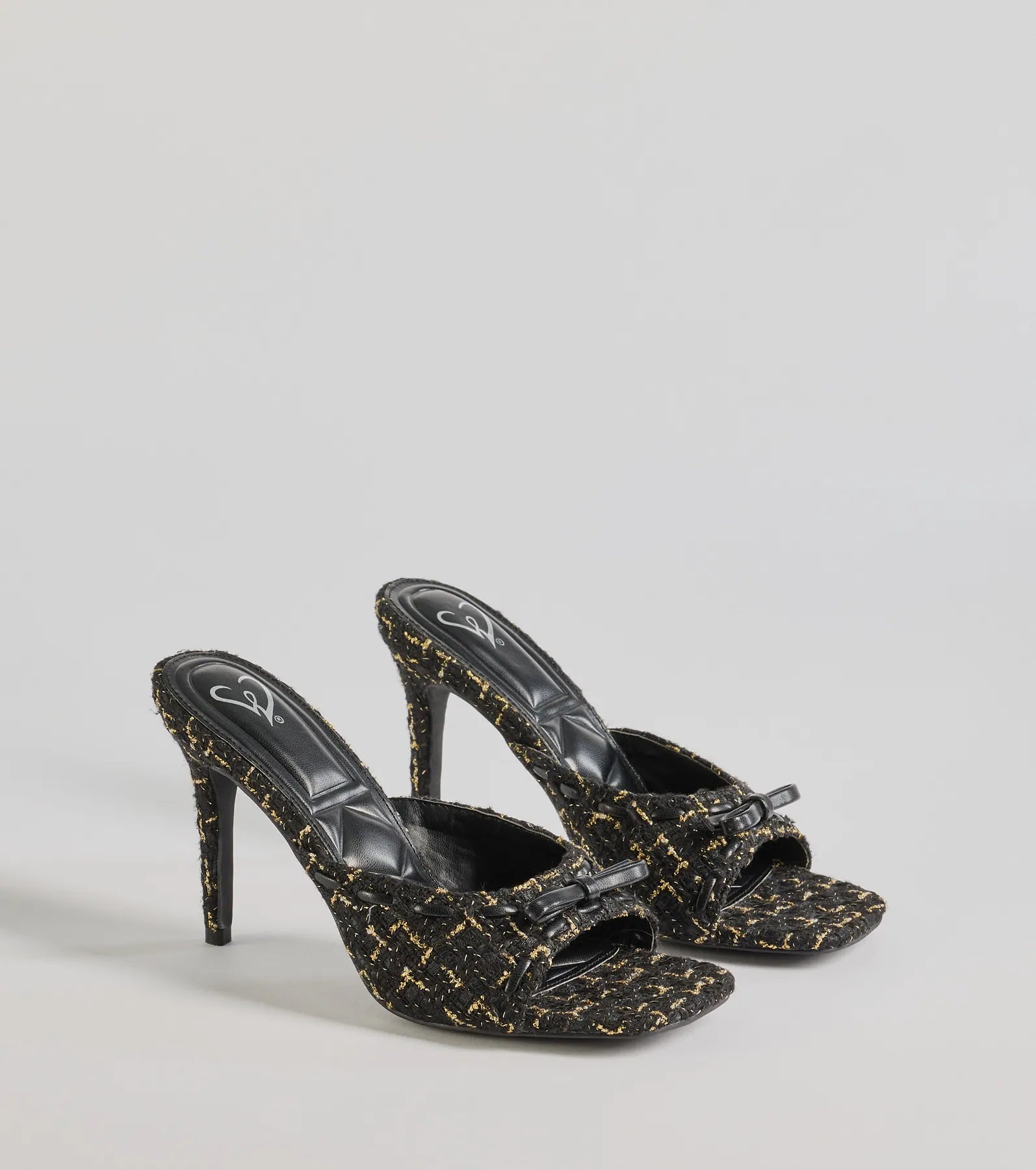 Dazzle in these mules shoes. With a chic stiletto heel, open square toe, and mini bow accent, these mules bring luxe vibes to every step.