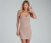 Ready to party? This glitter mini dress sure is! It features a sleeveless, cowl neckline, spaghetti straps, and a form-fitting silhouette on a short hem. Complete the look in earrings and lucite heels.