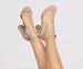 Show up to the party sparkling in these glam block heels featuring an almond toe, block heel, back zipper closure, and a strappy design with all-over rhinestone insets. Complete the look with a matching clutch.