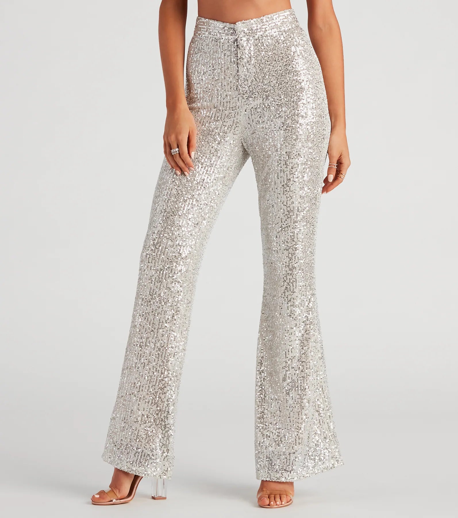 Put on a stunning show of sparkle in these dance-floor-ready sequin flare pants featuring a high-rise waist, hidden front zipper and hook-eye closure, and a hip-hugging silhouette with a flared hem. Complete the look in a tie-front top for a night out!
