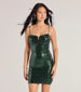 Sparkle and stun in this sequin mini dress, which features a sultry V-notched sweetheart neckline and a sassy bodycon silhouette. Complete the look with earrings and heels.