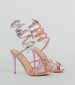 Step out in style and spread your wings with confidence in these butterfly stiletto heels! These spiral stilettos feature an almond toe and rhinestone embellished straps with whimsical butterfly decorations, rhinestone trim, and mesh wings. The metallic-coated faux leather material gives off a bold and daring vibe to your dressy look! Complete with a strapless mini dress.