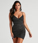 The world is your stage and you're the star of the show in this glitter mini dress! It features a sleeveless V-neckline with spaghetti straps, a surplice bodice, and an asymmetrical wrap hem on a bodycon silhouette. Complete the look in statement earrings.