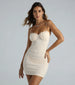 This faux pearl mini dress will make a statement at parties or celebrations! It features a sleeveless sweetheart neckline with flirty ruffle trim, adjustable spaghetti straps, a ruched bust, and a bodycon silhouette on lined mesh fabric with faux pearl embellished accents. Complete the look in this mini-length dress with clear mules for a seamless chic style!