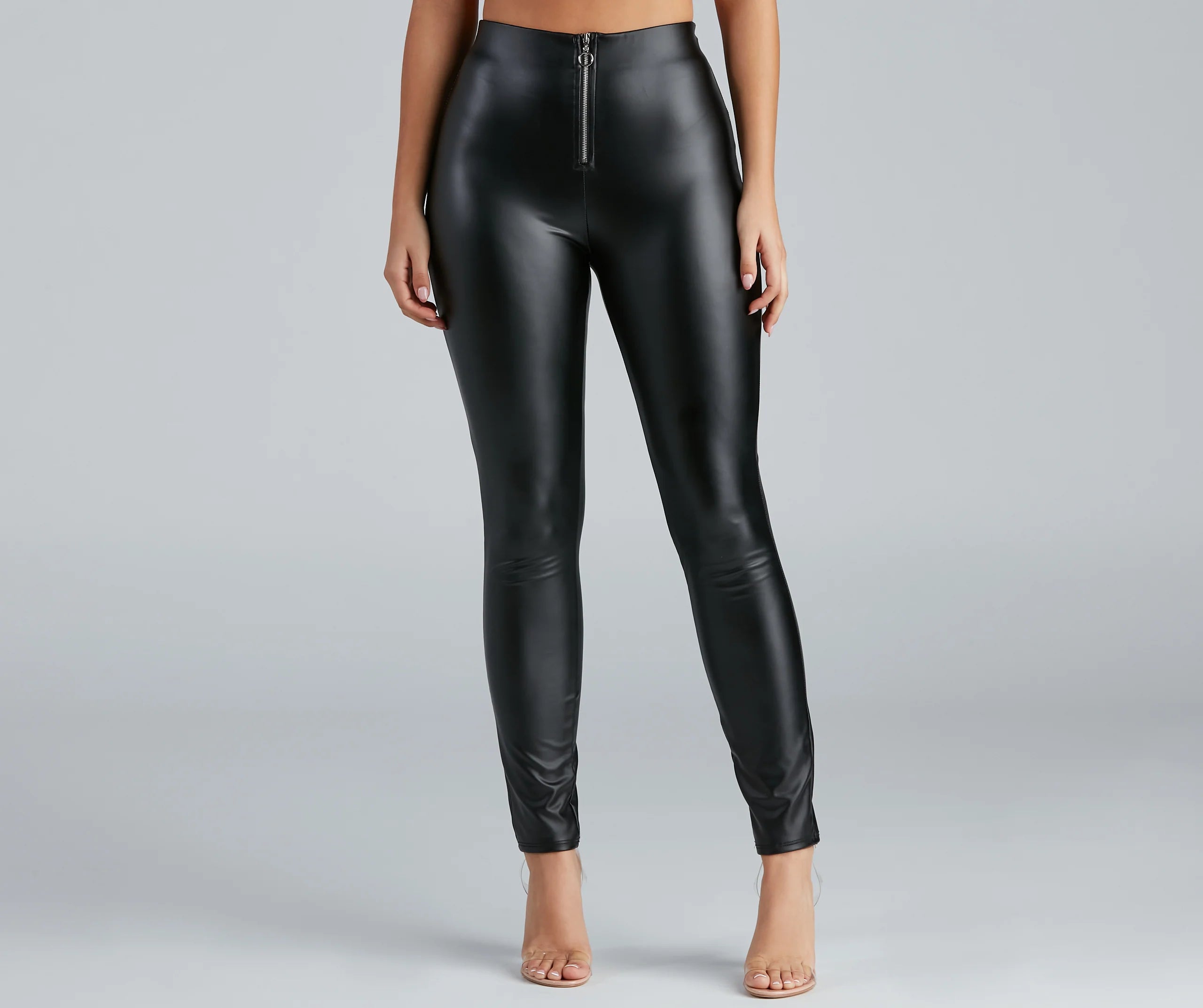 Steal the scene in statement leggings that command attention! The leggings feature an elastic high-rise waist, a zippered front with a mini O-ring accent, and a skinny tapered leg. The leggings are composed of a faux leather fabric that offers a form-hugging fit with slight stretch. Complete look with a faux fur jacket and mules.