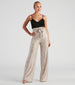 Step up the sparkle this holiday season with this gorgeous sequin jumpsuit. It features a knit top with a sleeveless V-neckline, adjustable spaghetti straps for a customized fit, and an exposed back zipper closure. The lined knit pants feature a high-rise paperbag waist with a tie-front belt, a wide-leg silhouette, and all-over sequin embroidery for the prettiest shine. Complete your party look with platform heels.
