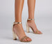 Elevate your shoe game for the party in these block heels. Designed with an almond toe, rhinestone toe strap, and an adjustable buckle ankle strap. The heels are composed of faux leather with a chrome finish and quilted footbed. Style with a high-low dress.