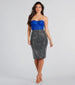 Amp up your going-out look with this striking glam rhinestone midi skirt that will draw all eyes to you! It features a high-rise waist, all-over small rhinestone embellishments for an ultra-glitzy sparkle, a midi-length hem with a back slit accent, and a bodycon silhouette to flaunt your figure. The woven fabric includes a mini-length knit lining. Complete your party 'fit with a bustier top and metallic heels.