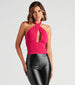 Strut your sultry self in this halter crop top showcasing plenty of skin in a sleeveless bodice with cross-style straps, a partial open-back, and a front keyhole accent on slinky knit fabric. Complete the look in faux leather pants for a night out.