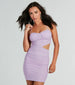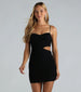 A stunning bodycon mini dress that creates a chic vibe for your next girl's night out! The short dress features a sleeveless sweetheart neckline with a built-in padded bust, adjustable spaghetti straps, a bold asymmetric side cutout at the waist, all-over ruching, and a mini-length hem with a curve-hugging silhouette, this mini dress was made to be the center of attention. The sheer mesh fabric includes a full knit lining. Style the party mini dress with clear heels.