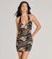 If you love to be noticed, you'll be a stylish sensation in this abstract mini dress out on the town! Featuring a flattering and adjustable tie at the halter V-neckline, a ruched bodycon silhouette, and a playful mini-length hem, this dress is designed to make you feel confident and chic. Complete the look in high heels and earrings.