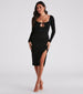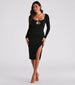 This long sleeve midi dress is such a stylish staple! Featuring a square neckline with a chic center cutout at the bust, long fitted sleeves, a midi-length hem with a front slit, and a form-hugging fit, this crepe dress can be styled up or down. Pair with strappy mules for a date night.