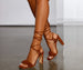 Stun like the diva you are with stylish block heels that command attention! The heels feature an open back, lace-up straps, an open square toe with a ruched strap over the toe, and a thin block heel. The heels are composed of a faux suede material. Complete look with a ruffled dress and dainty rings.