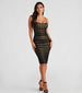Keep all eyes on you in this sultry glam mesh midi dress! It features a sleeveless square neckline, adjustable spaghetti straps for a customized fit, piping at the bust to give the illusion of a corset design, ruching down the side seams, and a midi-length bodycon silhouette that will hug your curves. Style with a pair of strappy stilettos.