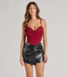 Create a sultry-chic night-out look with this bustier top designed with lined mesh and twill fabrics and a lace bust design. It features a sleeveless sweetheart neckline detailed with a mini bow, a ruched cowl draped overlay, lace adjustable spaghetti straps, and an angled mid-length hem with a form-hugging fit for that snatched silhouette.