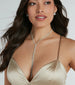 Radiate a stunning sultry sparkle with this rhinestone twisted lariat necklace! It features two rows of rhinestones leading to a chic center twisted design along the long lariat, ending with cascading rhinestone fringe. Style with a sleek satin formal dress with a plunging neckline for a gorgeous look.