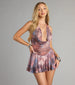 Serving just the right mix of sultry and carefree. This tie-dye mesh halter mini dress features a draped neckline and an open back with tie closures, making it perfect for vacay or beachside cocktails.