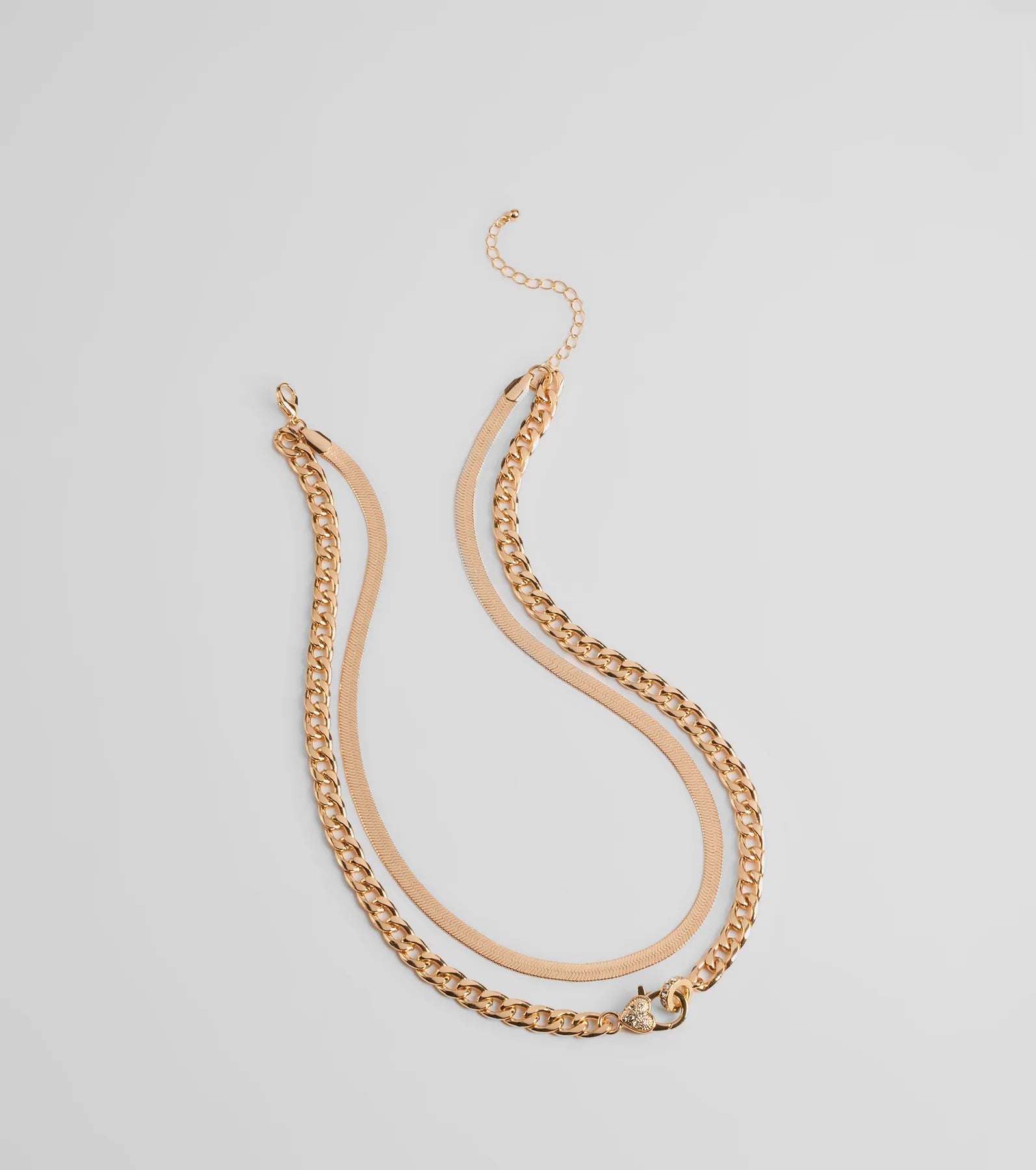 Show your sweet edge in this layered chain necklace with a rhinestone embellished heart cuff lock and a secure lobster clasp closure. Pair with a moto jacket.