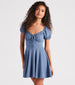 This eyelet lace dress is sure to be the sweetest style in your closet! It features puff short sleeves, a sweetheart neck with a bust tie, ruched bust, and a fit and flare skater silhouette. Complete the look with a ring set and heels.