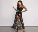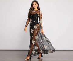 Let this mesh dress show off your sweet side. Make a statement for your next date night in a sheer mesh dress that features a crew neckline, fitted long sleeves, an embroidered floral design, and a sweeping maxi length silhouette. Complete your look with a black bodysuit and mules.