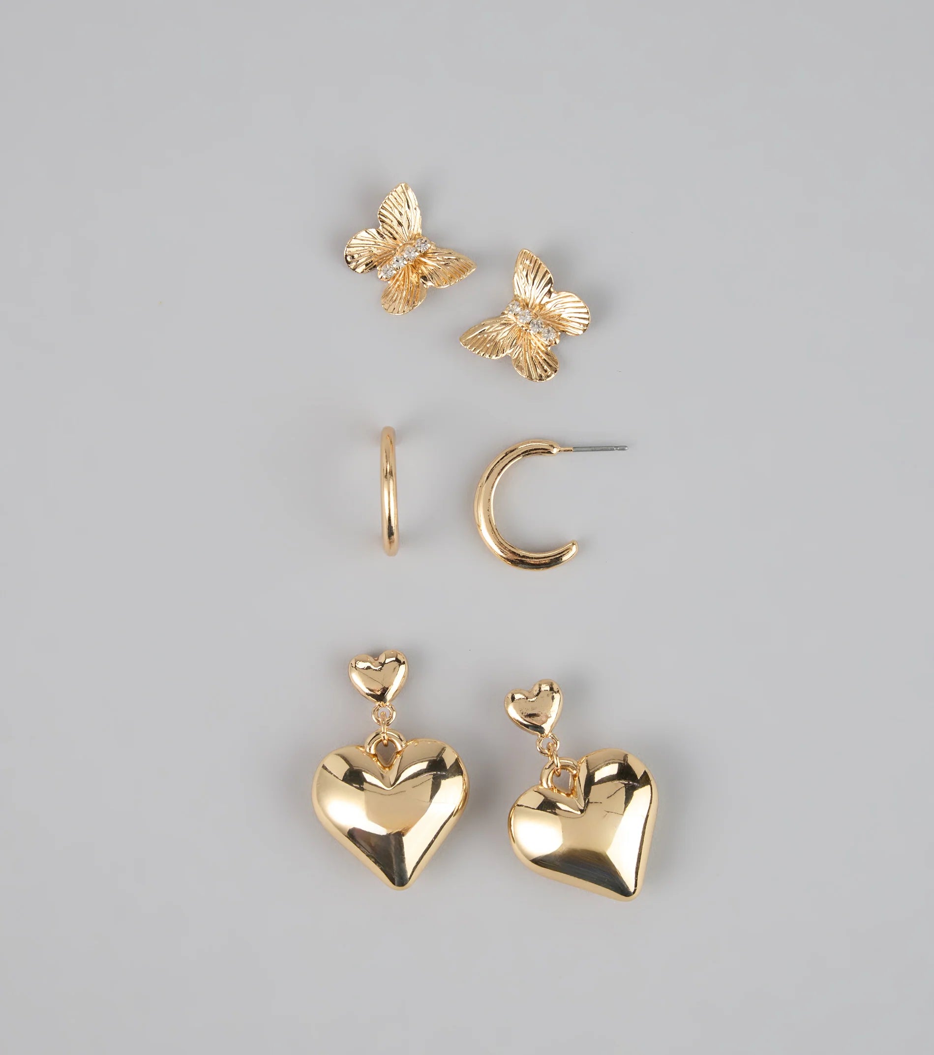 One pack, three moods. From rhinestone butterflies to hoops to heart charms, this earring set gives you all the sparkle and sweetness to swap your vibe on the daily.