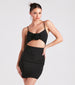 Short, sweet, and makes a statement! This little black dress features a sleeveless V-neckline, adjustable spaghetti straps, a rose applique along the bust, a cutout bodice, and a form-hugging silhouette. Complete the look in chunky platform heels.