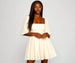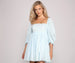 Showcase a sweet style this season in this adorable babydoll dress. It features a square neckline, three-quarter length puff sleeves with ruffled cinched hems, a high waist seam under the bust, and a flowy short A-line silhouette. Pair this dress with dainty earrings and cute wedges for an effortless look.