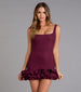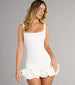 Giving drama from every angle. This ruffled tulle mini dres brings the chicness with a low back, bodycon fit, made for bridal showers, birthday brunches, or dressy soirees.