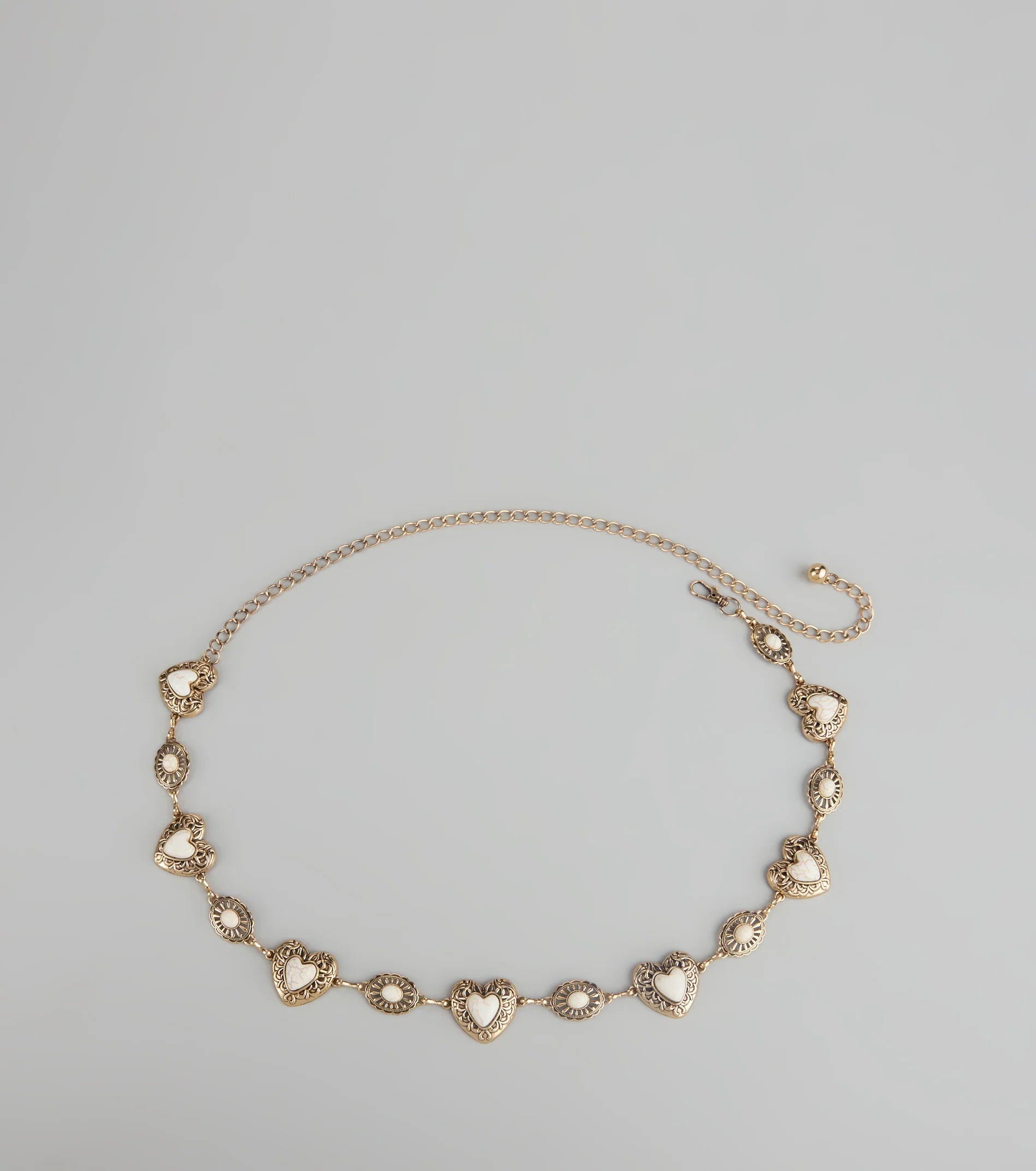 Serving vintage romance with a cool-girl twist. This chain belt with heart-shaped conchos and colored stone insets instantly upgrades denim, dresses, and everything in between.