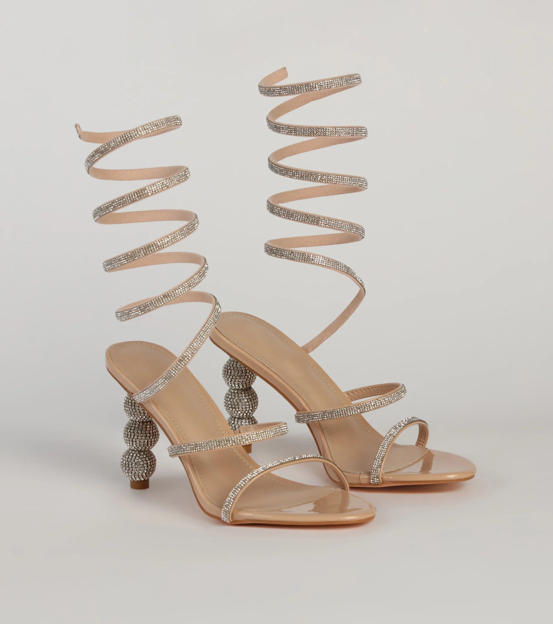 In these heels, everyone will take notice of you! They feature an almond toe, dual rhinestone-embellished foot straps, a spiral rhinestone-embellished ankle strap, and a glitzy rhinestone ball decorated heel. Complete the look with a glam shoulder bag for a black tie soiree!
