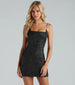 Take the night by glitter in this sparkling mini dress perfect for a shimmering night out! Featuring a sleeveless square neckline, bungee spaghetti straps, an open strappy back, and a flattering bodycon silhouette and mini-length hem. Complete the look in chic block heels.