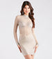 Babe, you'll be the firework strutting into the room wearing the Tate party dress to sparkle at birthdays or New Year's Eve! She features fitted long sleeves adorned with rhinestone cuffs, a mock neckline, and a sheer bodice with rhinestones along her bust, and a short bodycon skirt with rhinestone embellishments. The formal dress is composed of a sheer mesh fabric with an opaque fabric at the skirt. Style with strappy rhinestone heels to complete your dazzling look!