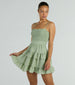 It's time for afternoon tea and this skater dress will make an adorable entrance! Get ready to sashay in this dress featuring a ruffle trim square neckline and tiered ruffled short-length hem to add a playful touch to the skater silhouette. And with adjustable spaghetti straps and a stretchy smocked bodice, you'll be comfortable all day. Complete the look in chic wedges and a flouncy hat.