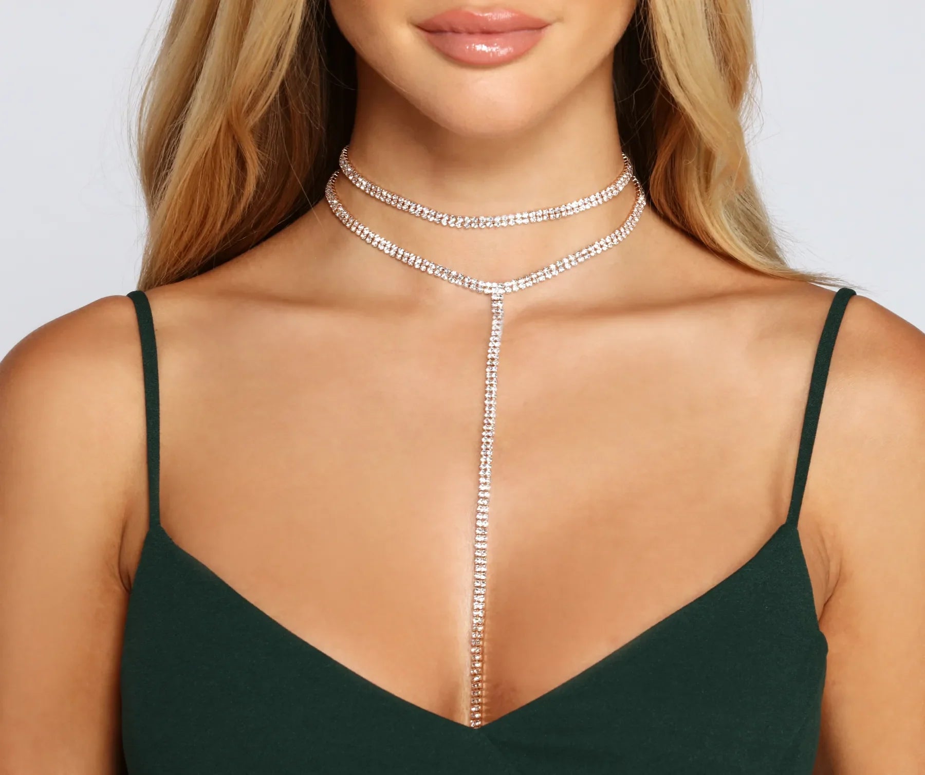 Live the glam life with a choker set that illuminates your night! The set includes two chokers that feature a Y-shape with a four-row design of mini rhinestones and a gorgeous lariat that cascades down. Complete look with a formal dress and rhinestone heels.