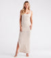 Take your trendsetting status to chic summer style with this sleeveless knit maxi dress perfect for styling over your swimsuit! It features a scoop neckline, tank shoulder straps, a form-hugging fit, and a flirty high-side slit on crochet-style knit fabric with a short stretchy lining. Complete the look in sunglasses and sandals!