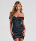 Bring the wow factor to your next date night with a mini dress that leaves them speechless! The dress features an off-the-shoulder neckline, sweetheart bust with padded cups, no sip-strip, short sleeves, contrast piping seams, ruching, and a wrap mini-length silhouette. The dress is composed of a form-hugging stretchy satin fabric. Complete look with chrome heels.