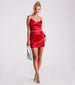You'll look totally luxe in this silky-chic satin mini skirt! It features a high-rise waist, front ruched detailing, a mini-length hem, and a curve-hugging silhouette. The smooth satin-knit fabric offers a moderate stretch. Style with the matching crop top and a rhinestone handbag.