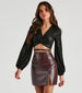 Make heads turn in this striking crop top featuring long peasant sleeves, a plunge V-neckline, and a twisted bodice with wrap ties on metallic foil knit fabric. Complete the look in sleek faux leather leggings.