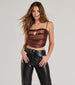 Level up the trend factor of your night out look in this satin crop top featuring a sleeveless cowl neckline with a sleek buckle trim, a sultry bust cutout, adjustable spaghetti straps for a customized fit, and an asymmetric cropped hem. Style with faux leather pants and mules!