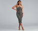 Showcase your trendy-chic status in this of-the-moment midi dress! It features a sleeveless halter neckline, spaghetti straps that lead to a cross-back lace-up strappy design, a sleek front O-ring accent, a midi-length, curve-hugging silhouette, and an all-over geometric striped pattern. Style this dress with heeled mules.
