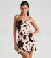 Show off your trendy style in this adorable cow print slip dress! It features a sleeveless V-neckline, bungee spaghetti straps, a stylish small front slit, and a short fitted silhouette. Complete the look with ankle booties.