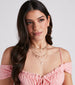 Give off trendy glam babe energy in this embellished charm necklace set! It features two necklaces, including a single snake chain necklace, and a five-row layered necklace with dainty chains, mini rhinestones, and small charms featuring butterfly, star, sun, moon, and cross designs. Style this set with sleek hoop earrings.