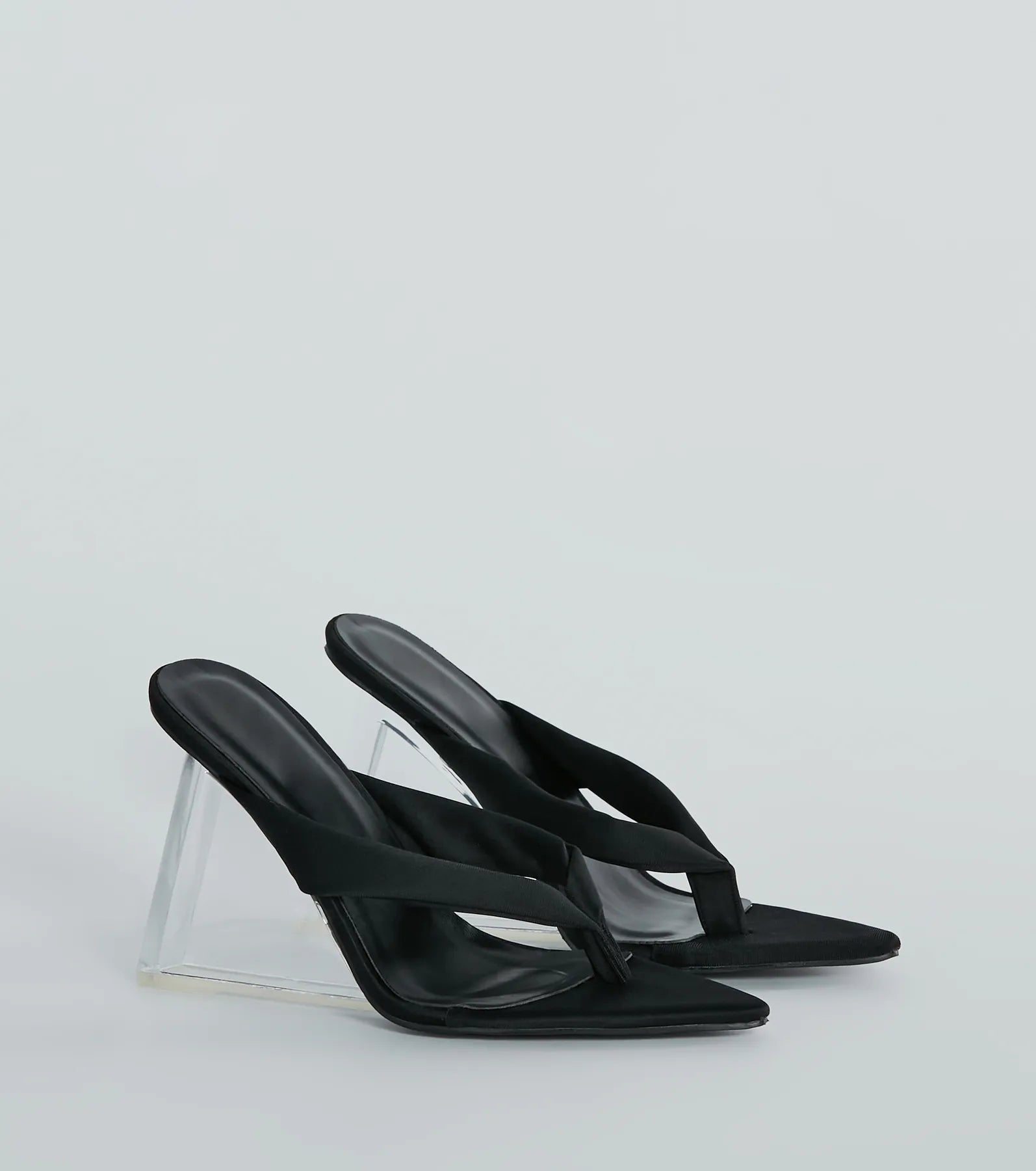 Turn on trendy mode with these fab thong strap clear wedges! They feature a clear wedge cutout heel, an open pointed toe for that sleek look, a lycra thong strap design, and an open back for effortless on-and-off styling. Pair these heels with hoop earrings and a chic handbag!