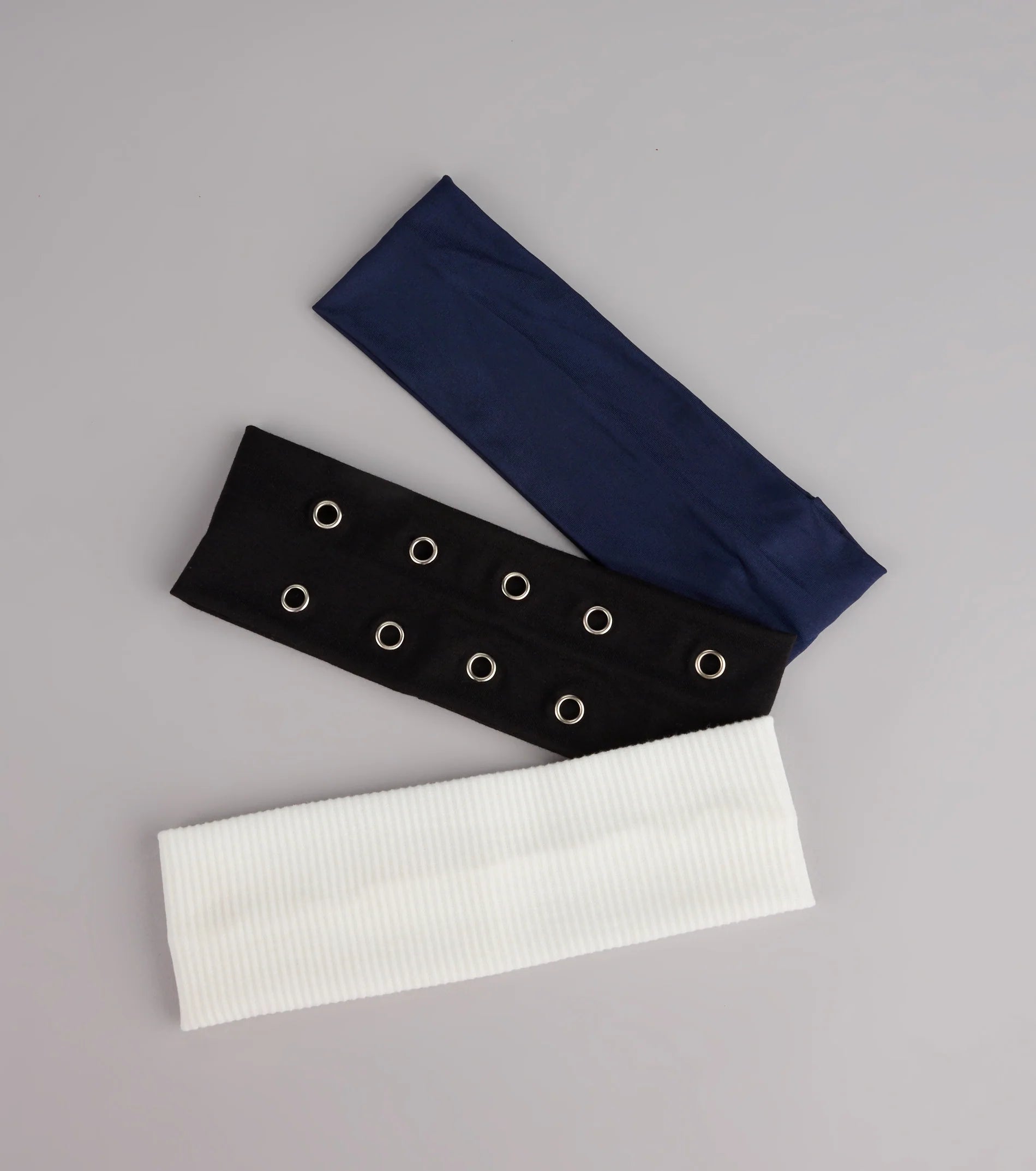 One pack, endless moods. This three-piece wide headband set comes with a smooth knit, a rib knit, and a grommet trim style—so you can switch up your vibe anytime.