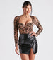 Bring out your true beauty with a bodysuit that enhances your femme allure! It features fitted long sleeves, a sweetheart neck with scallop trim, a padded bust, and a sheer bodice with a thong bottom and snap-button closures. Composed of partially lined mesh fabric with a burnout velvet pattern and minimal stretch. Style with a faux leather skirt for wine night!