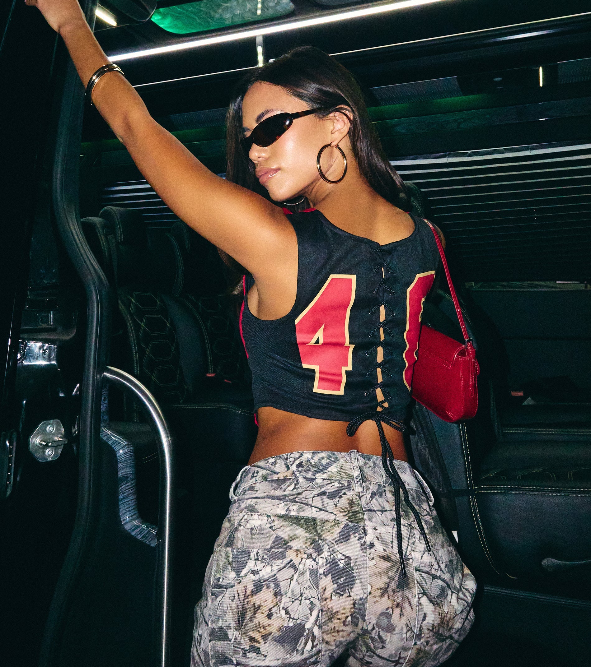 Game day just got hotter—this tank top is laced up and ready to score. With its corset-inspired fit and bold San Francisco 49ers graphic, it’s the perfect mix of sporty and sultry.
