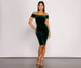 Bring the luxe in a velvet dress that brings sophistication to your cocktail affair. The dress features an off the shoulder neckline with short sleeves, a midi length silhouette, and a bodycon fit. Complete your evening outfit with a pair of clear heels and a dainty rhinestone bracelet.
