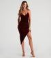 Vibe in this vivacious velvet midi dress for your next semi-dressy affair! It features a sleeveless halter cross-style neckline, sleek bungee spaghetti straps, a strappy open-back, and a side ruched seam to accentuate your curves along the asymmetrical slit hem. Complete the look in sparkly heels.