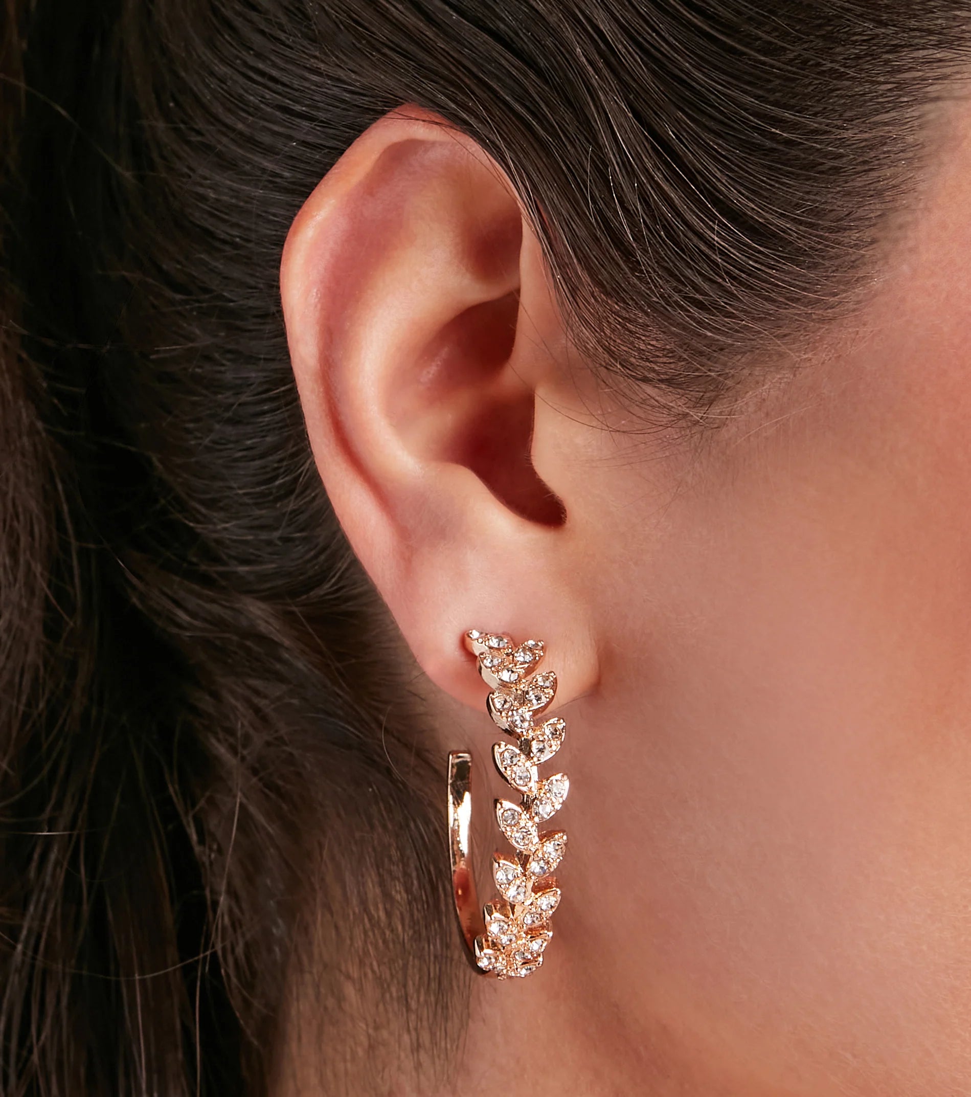 Charming and luxe! Adorn your ears in these chic earrings featuring a half hoop design with a front leaf pattern with mini rhinestones and a post-back closure. Style with a glam bracelet to complete your semi-formal or formal dress!