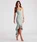 Elevate your style with this well-refined crepe midi dress perfect for wedding showers or dressy parties! It features a sleeveless V-neck, spaghetti straps that cross in the back, a form-fitting silhouette, and a flirty ruffled high-low hem. Complete the look in sassy mules and a clutch.